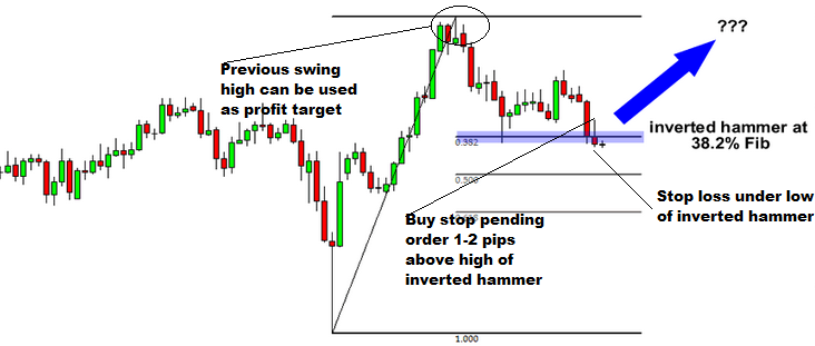 Dưới đây là ví dụ cho cách vào lệnh này. Các ngưỡng Fibonacci được tạo ra bằng cách sử dụng đáy và đỉnh của đợt tăng giá trước đó. Khi thị trường giảm và tiến về khu vực thoái lui 38.2% Fib, một nến Inverted Hammer được tạo ra.