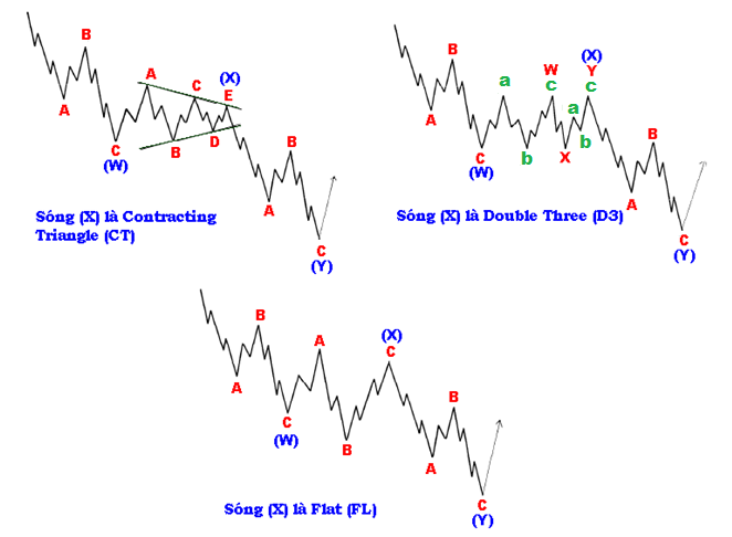 - Sóng (Y) có thể theo bất kỳ mô hình điều chỉnh nào trừ các mô hình Double hoặc Triple. Sóng (Y) phải lớn hơn sóng (X) về giá trừ trường hợp sóng (Y) là mô hình Triangle (Contracting, Expanding).
