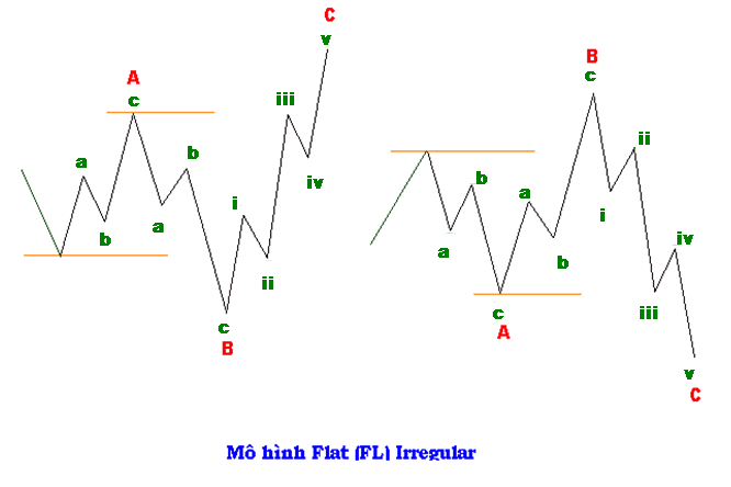 Mô hình sóng Flat Irregular là dạng sóng đặc biệt phổ biến của mô hình sóng Flat. Ở đây sóng B được mở rộng và vượt qua điểm cuối của sóng chủ trước đó (nói cách khác là vượt qua điểm khởi đầu sóng A).