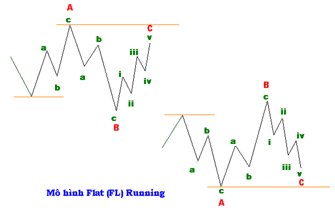 Với mô hình Flat Running thì điểm cuối của sóng C không vượt qua điểm cuối của sóng A. Điều này thể hiện sức mạnh của xu hướng chính.