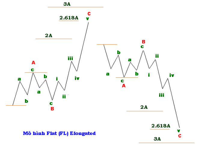 Với mô hình Flat Elongated thì sóng C rất dài so với sóng A, có thể dài bằng 2.618 lần sóng A. Ở dạng sóng này thì sóng C thường theo dạng sóng chủ mở rộng sóng thứ 5.