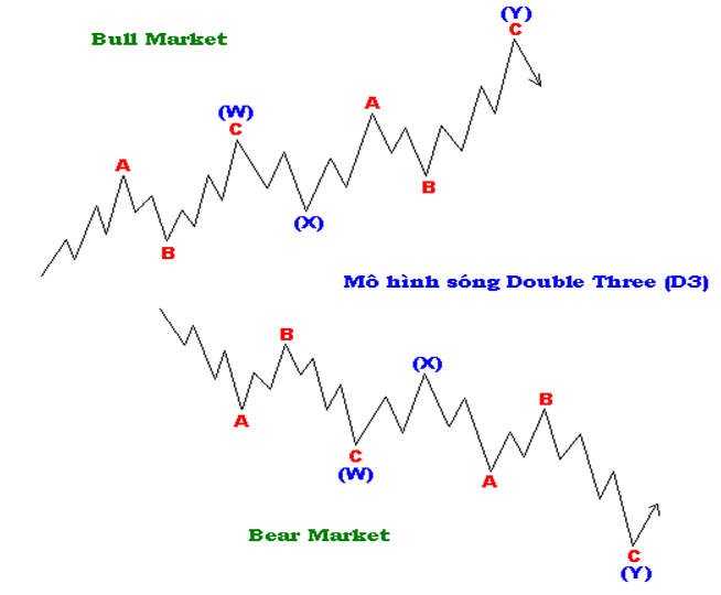 Mô hình Double Three (D3) được biểu thị bằng các sóng (W)-(X)-(Y) trong đó các sóng (W), (Y) không cùng dạng sóng Zigzag (ZZ).