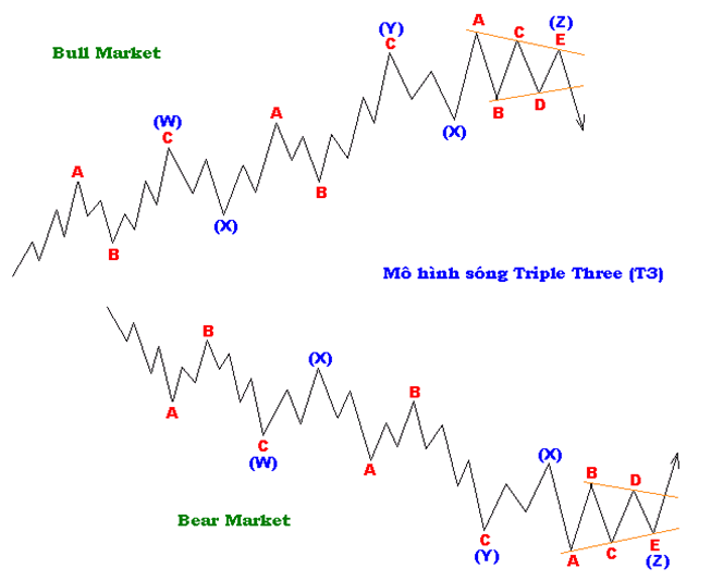 Mô hình Triple Three (T3) được tạo thành bằng 3 mô hình sóng điều chỉnh với điều kiện không cùng dạng Zigzag (ZZ) được nối với nhau bởi hai mô hình điều chỉnh ngắn gọi là sóng (X).
