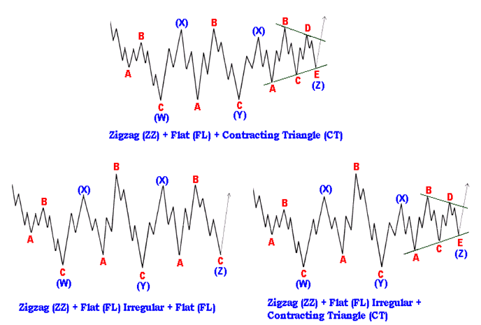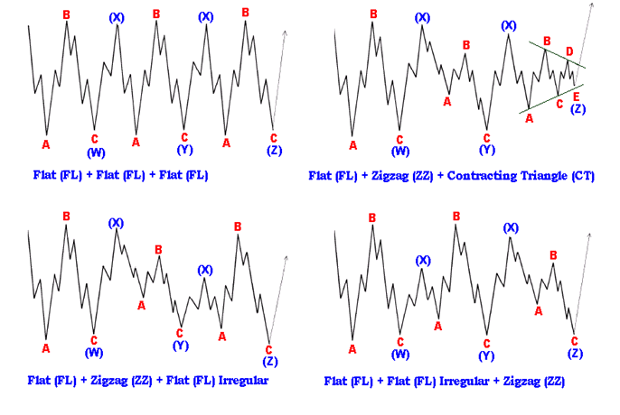 Sóng (W) là các dạng Flat (FL) trong khi sóng (Y) và sóng (Z) là các dạng Flat (FL), Zigzag (ZZ) hoặc Triangle (Contracting, Expanding) nhưng sóng (Z) không là Zigzag (ZZ) khi sóng (Y) đã là Zigzag (ZZ):