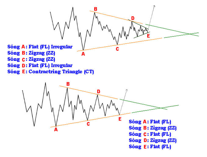 - Sóng E có thể là một Zigzag (ZZ), Double Zigzag (DZ) hoặc Triple Zigzag (TZ) hoặc Contracting Triangle (CT).