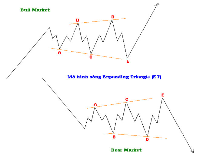 Mô hình Expanding Triangle (ET) rất ít phổ biến trong số các mô hình sóng Elliott. Trong mô hình này thì 2 đường kênh giá AC, BD mở rộng dần ra về phía bên phải.