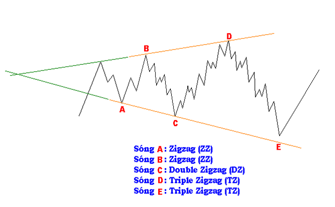 - Tất cả 5 sóng A, B, C, D, E phải theo các mô hình Zigzag (ZZ), Double Zigzag (DZ) hoặc Triple Zigzag (TZ).