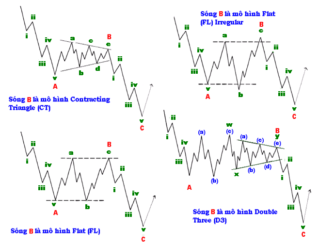 - Sóng B có thể theo bất kỳ mô hình điều chỉnh nào trừ mô hình Contracting Triangle (CT) và Expanding Triangle (ET).