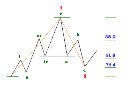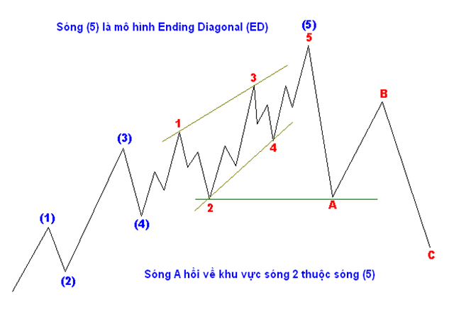 Sau mô hình Ending Diagonal (ED) trong sóng (5) thì sóng A hồi về sóng 2 của mô hình Ending Diagonal (ED) này.