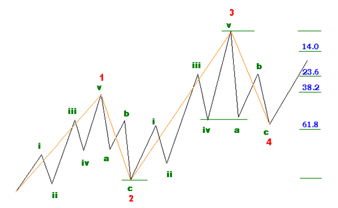 Sóng 4 thường hồi lại 38.2% hoặc 50% hoặc 61.8% so với sóng 3 nếu sóng 3 không phải sóng mở rộng.