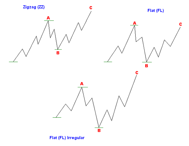 Trong mô hình Zigzag (ZZ) thì sóng B hầu như hồi lại 38.2% hoặc 61.8% sóng A.