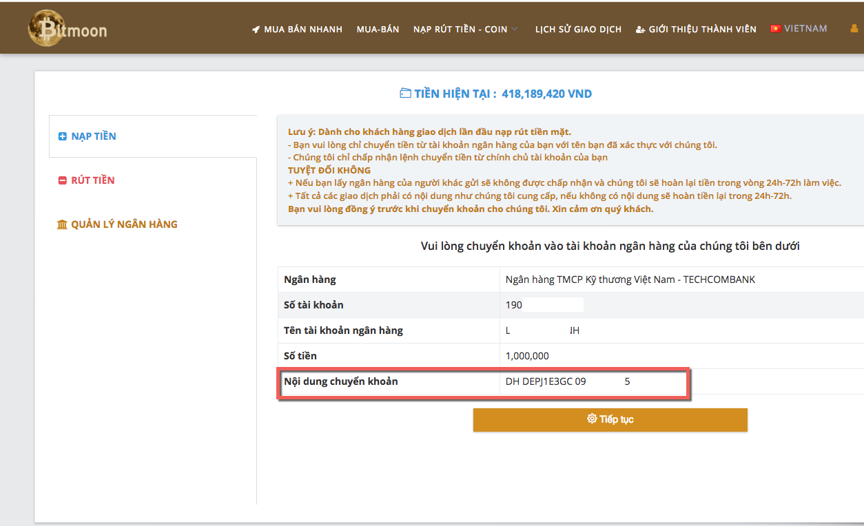Sau đó, anh em vào Internet Banking tài khoản ngân hàng của mình, chuyển tiền vào tài khoản mà Bitmoon yêu cầu. Đặc biệt, nội dung chuyển tiền phải thật chính xác, không được thay đổi gì nhé!