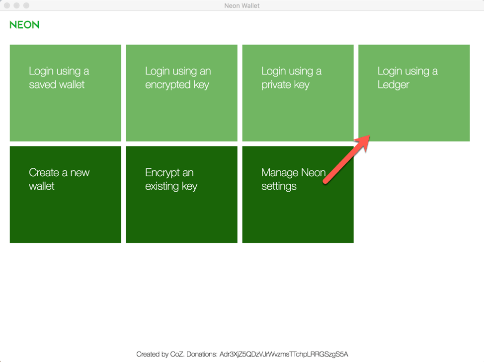 - Mở ví NEON và lựa chọn đăng nhập bằng Ledger.