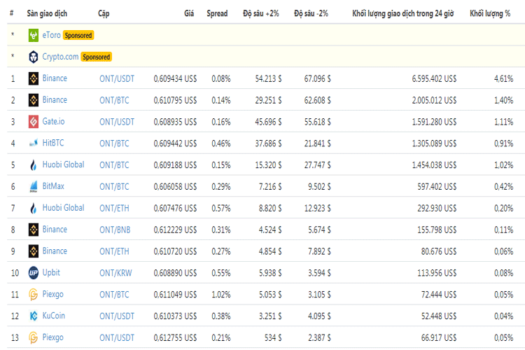 Hiện tại khi có nhu cầu muốn mua hay bán đồng tiền ảo ONT thì bạn có thể giao dịch đồng ONT tại nhiều sàn giao dịch lớn nhỏ trên thế giới như: Huobi, Binance, Gate.io, OKEx, Bitbns thông qua các cặp ONT/BTC, ONT/ETH, ONT/USDT hay ONT/INR. Trong đó khối lượng giao dịch ONT trên sàn Huobi và Binance là nhiều nhất.