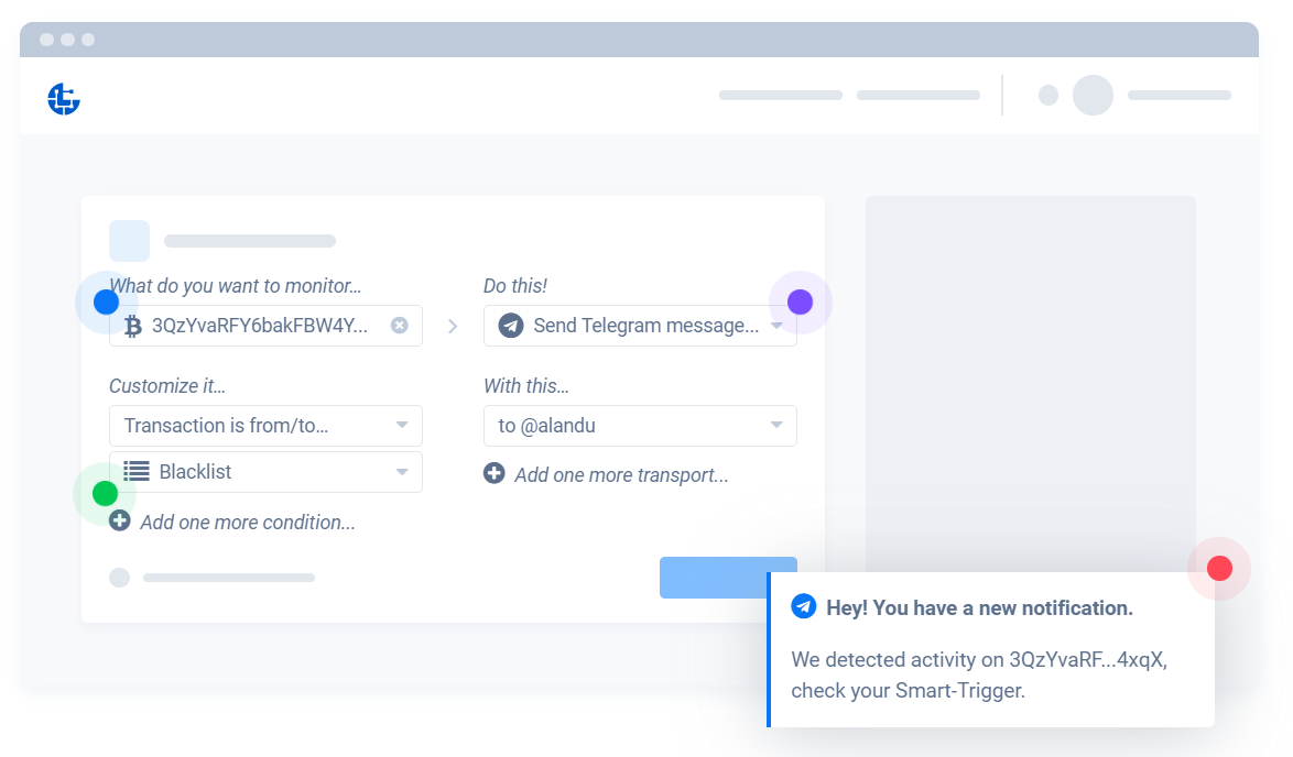 Ví dụ như ví A vừa nhận 1 BTC thì anh em sẽ nhận thông báo về điều đó ngay lập tức, có thể nhận qua Telegram chẳng hạn.