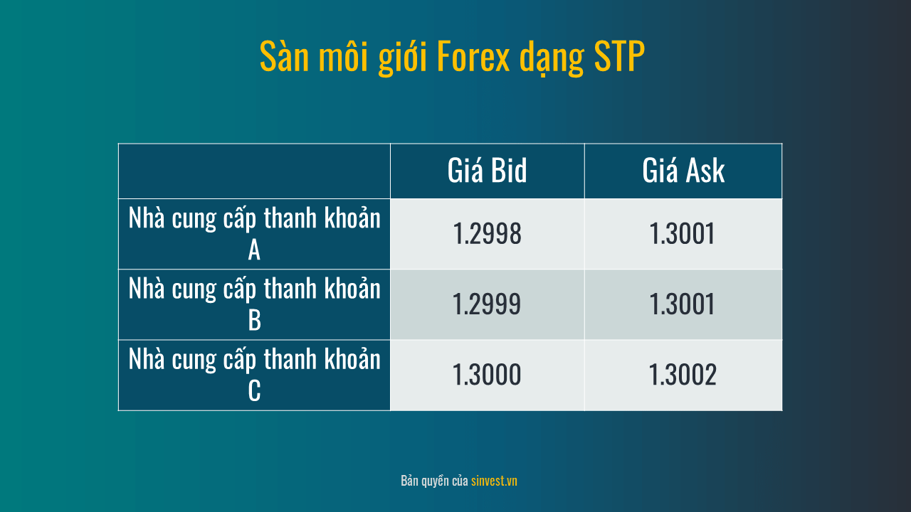 Các sàn môi giới No Dealing Desk STP thường có nhiều nhà cung cấp thanh khoản, mỗi nhà cung cấp sẽ có sự chênh lệch tỷ giá khác nhau.