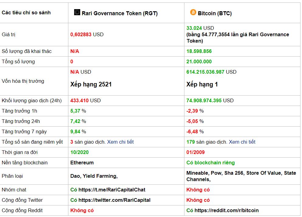 Bảng so sánh sức mạnh của 2 đồng tiền Rari Governance Token và Bitcoin, giúp bạn xác định giá trị tiềm năng của đồng tiền Rari Governance Token trong tương lai dựa trên giá trị hiện tại của Bitcoin và ngược lại.