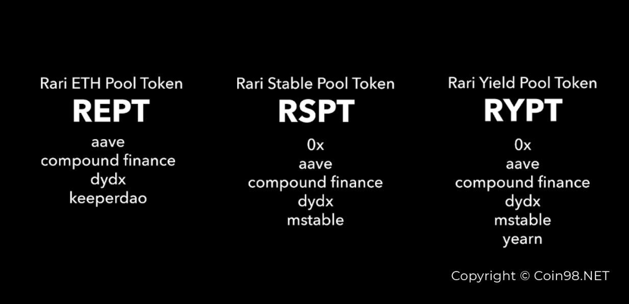 Rari Capital tối ưu hoá lợi nhuận thông qua chuỗi các tài sản ổn định (swap thông qua 0x) trong 3 pool tài sản trên Rari Capital được phân chia theo mức độ rủi ro khác nhau:
