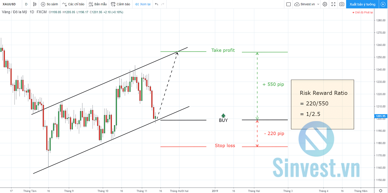Vậy bạn tính được Risk Reward = 220/550 = 1/2.5.