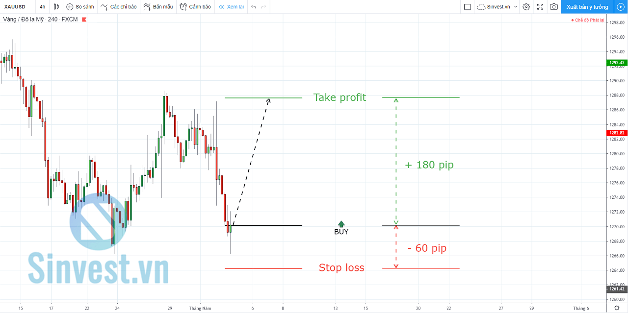 Bạn quyết định vào lệnh BUY khi nến H4 đóng cửa, Stop loss dưới bóng nến H4 1 đoạn, Take profit trên vùng kháng cự như hình. Bạn đo được SL = -60 pip, TP = +180 pip, từ đó Risk Reward của lệnh này là 1:3.