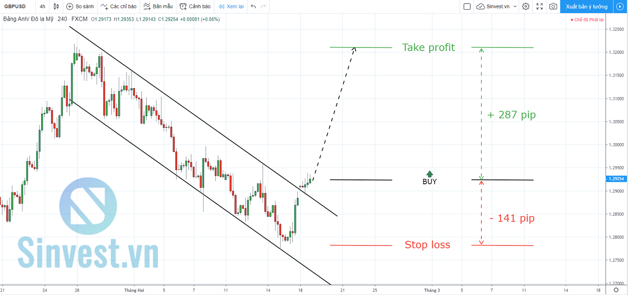 Bước 2: Đo khoảng cách Stop loss và Take profit bạn thấy SL = -141 pip, TP = +287 pip => Risk Reward ~ 1:2