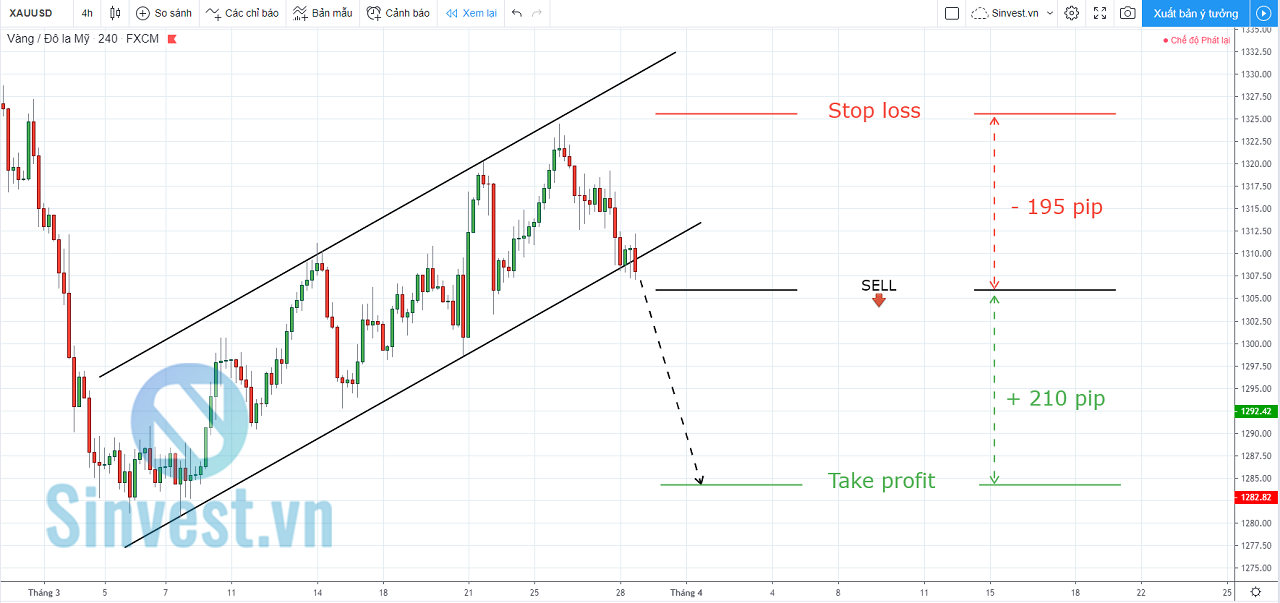 Bước 1: Sau khi xem xét đủ điều kiện vào lệnh SELL XAUUSD H4 theo chiến lược giao dịch trên, bạn đánh dấu điểm vào, Stop loss, Take profit như trên hình.