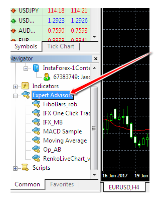 Tìm EA trong bảng điều khiển “Navigator” ở phía bên trái của nền tảng giao dịch của bạn. Nhấp vào dấu “+” để xem các robot sẽ được hiển thị.