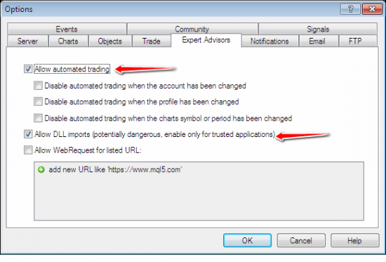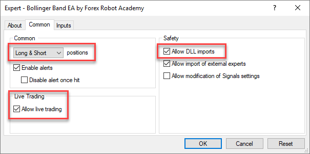 Nếu expert advisor của bạn không hoạt động, điều đầu tiên bạn nên làm là xác nhận xem các thông số khác nhau đã được chọn khi cài đặt chưa: