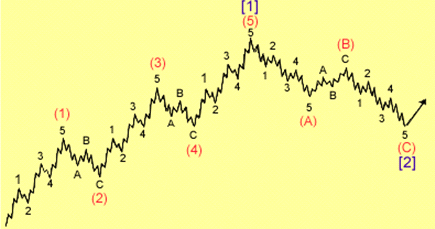 Cấu trúc sóng chủ của sóng 1 cho thấy dao động giá thuộc cấp độ sóng lớn hơn là sóng (1) theo chiều đi lên. Quá trình điều chỉnh ở sóng (2) theo sau là sóng (3), sóng (4) và sóng (5) sẽ hoàn thành mắt xích sóng chủ của cấp độ sóng lớn hơn nữa là sóng [1].