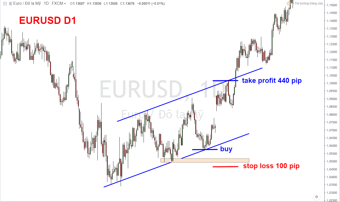 Take profit sẽ tại trend line trên của kênh giá, khoảng cách khoảng 440 pip.