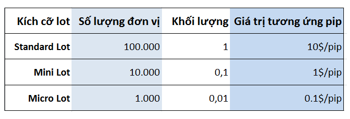 - Standard lot (lô tiêu chuẩn) có kích thước 100.000 đơn vị