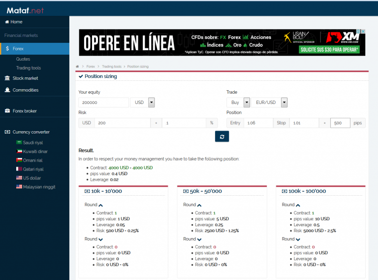 Dưới đây là hình ảnh minh hoạ về máy tính kích thước lô trực tuyến có sẵn tại Mataf.net: