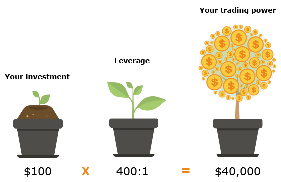 Tính năng đòn bẩy cho phép bạn mượn tiền của sàn để giao dịch một kích thước lô lớn với số vốn ký quỹ nhỏ.