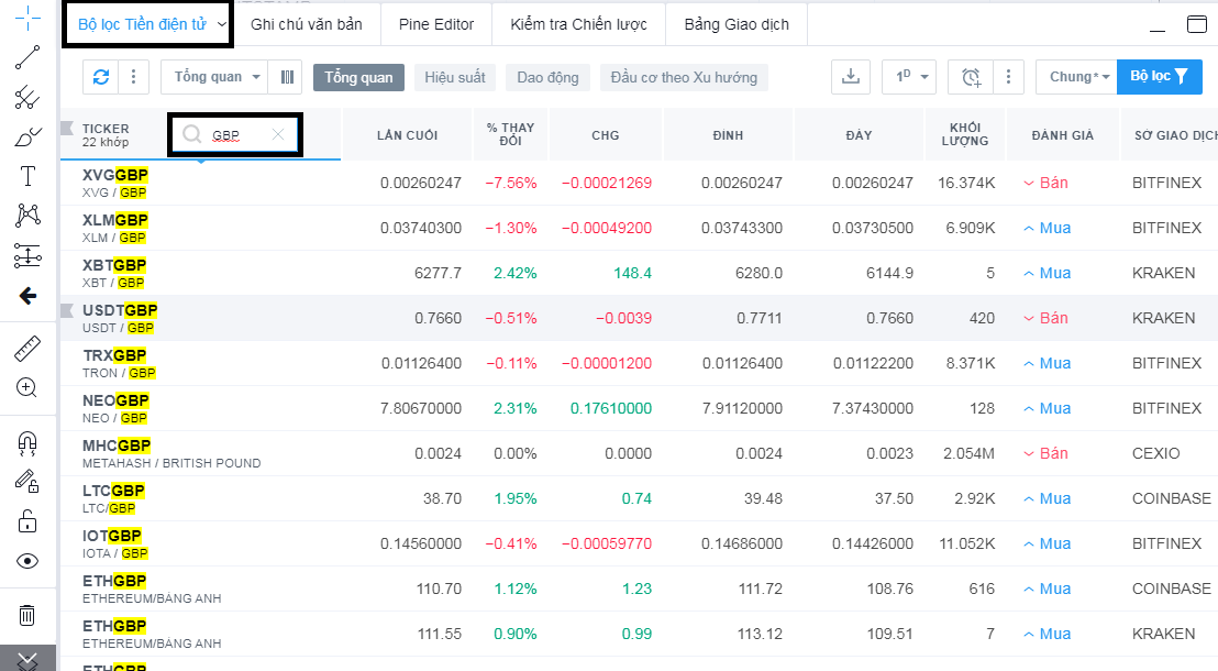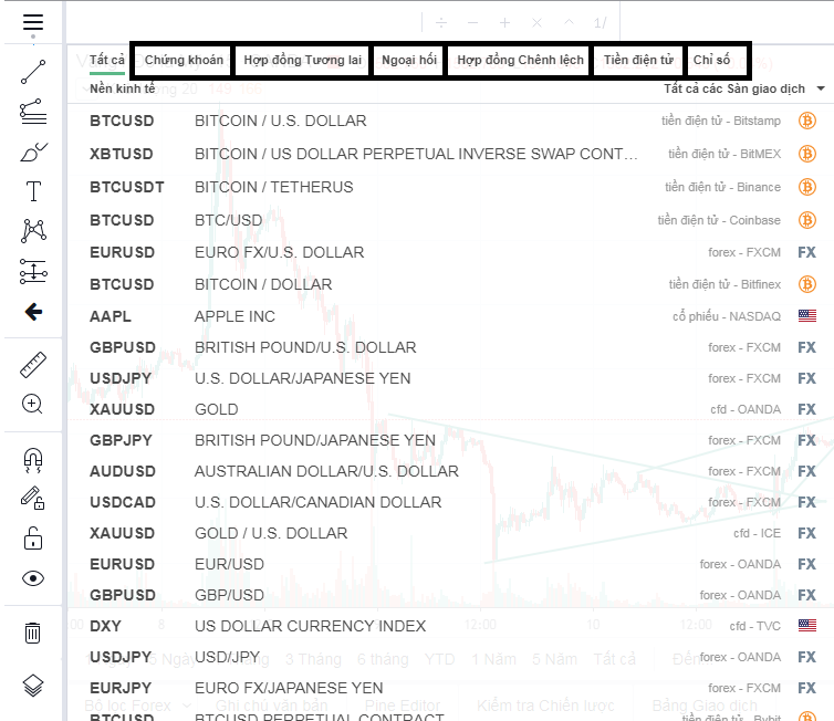 Bộ lọc: TradingView cung cấp rất nhiều sản phẩm khác nhau, nên phần này chính là để người dùng tự lọc các sản phẩm theo ý muốn của chính họ. Trong đó, TradingView cho phép bạn lọc theo 3 dạng gồm: Bộ lọc cổ phiếu, Bộ lọc forex và Bộ lọc tiền điện tử.