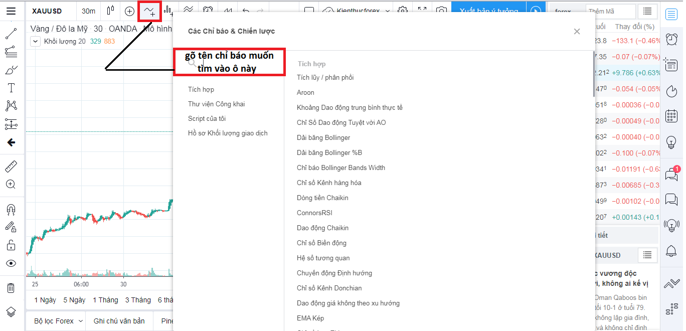 Thanh công cụ tìm kiếm: muốn tìm nguồn tài nguyên nào có trong TradingView từ Forex, Chứng khoán, Hàng hóa, Chỉ số hay các loại tiền điện tử thì bạn có thể gõ tại đây.