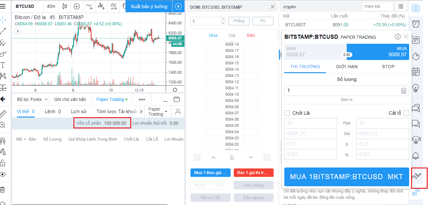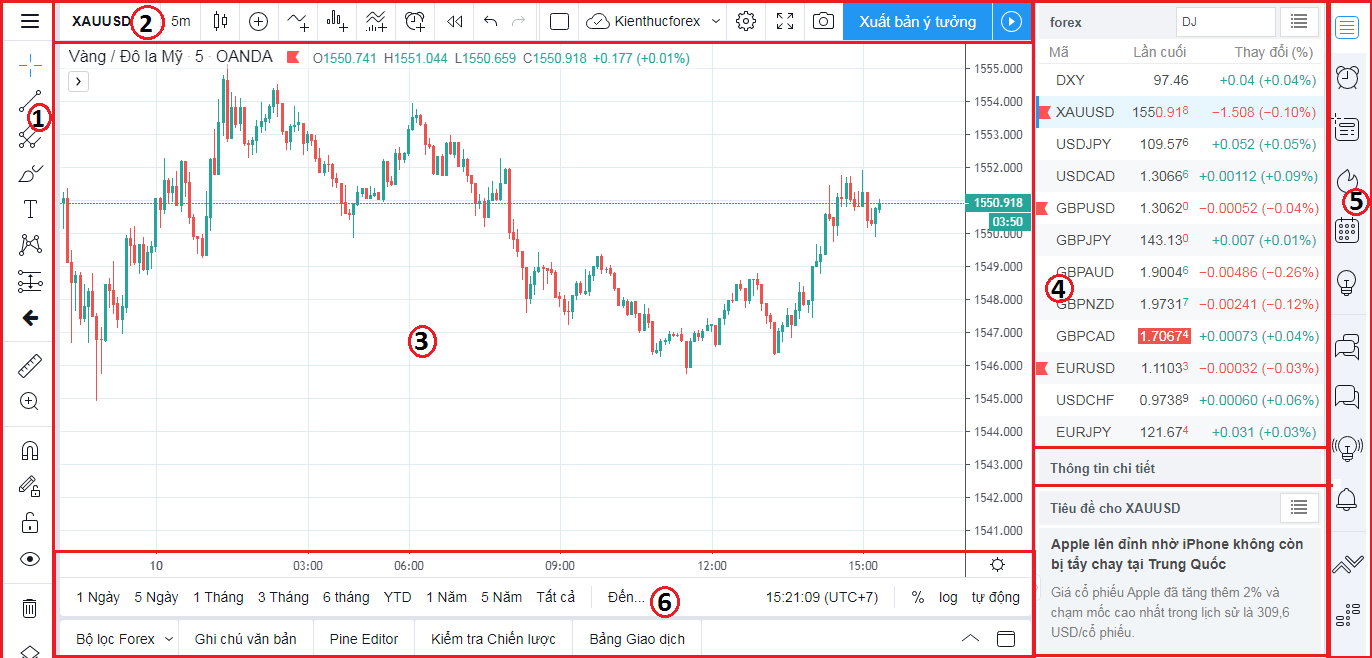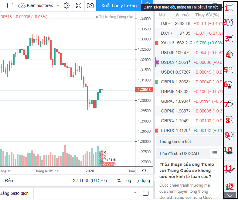 Phần 4 – 5: Khu vực Right Toolbar chứa các thông tin liên quan tới sản phẩm được tạo ra bởi chính bạn. Ngoài ra, TradingView còn tích hợp thêm phần tin tức hay các thông tin về giá cả sản phẩm để trader tiện theo dõi.