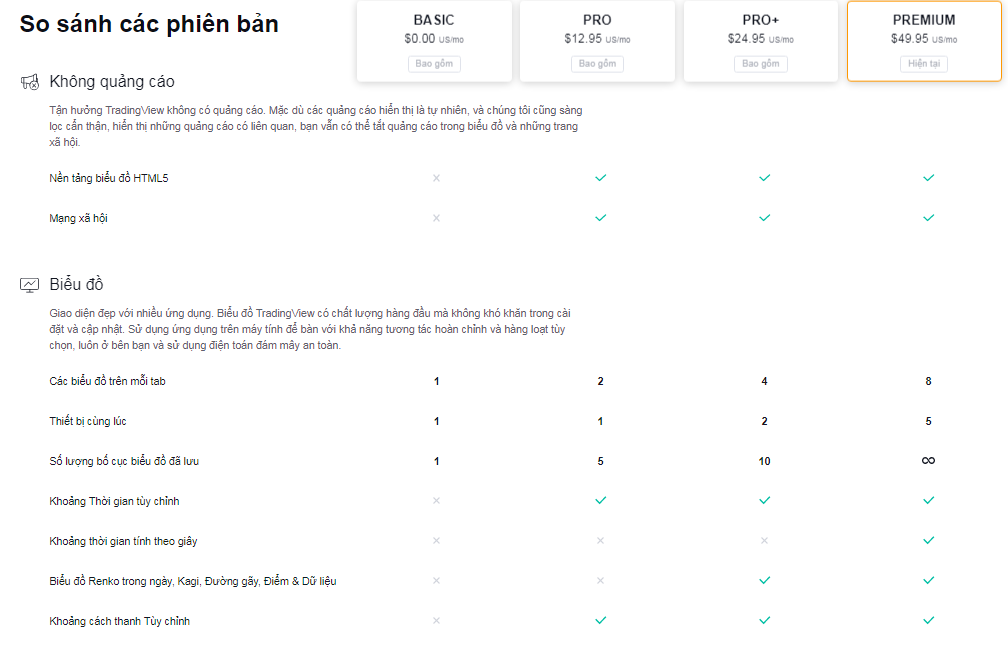 Lý do phải nâng cấp lên tài khoản trả phí là bởi như có nói trước đó, tài khoản basic sẽ bị TradingView giới hạn rất nhiều tính năng. Thậm chí, các tài khoản trả phí khác như Pro và Pro+ tuy có thêm nhiều tính năng hơn, nhưng vẫn bị hạn chế, không thoải mái như tài khoản Premium.
