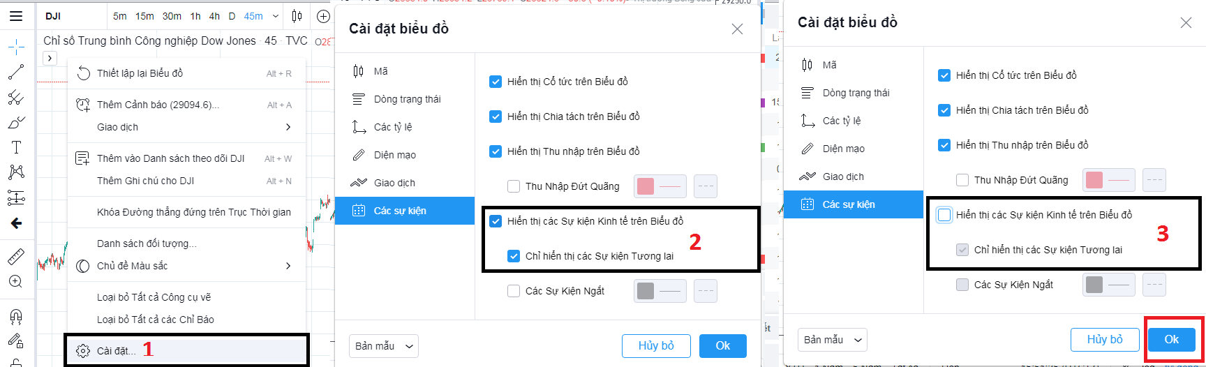 Để tắt phần này, bạn chuột phải vào phần biểu đồ chính (Main Chart), sao đó chọn cài đặt sau đó tìm đến dòng “các sự kiện” sau đó bỏ dấu tại ô “hiển thị các sự kiện kinh tế” rồi nhấn Ok là xong: