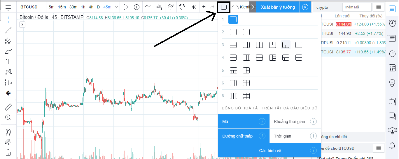 Đây là tính năng mình cực kỳ thích của TradingView. Phân chia biểu đồ tại TradingView sẽ có 2 tùy biến cho bạn chọn lựa gồm: chia bố cục bằng những cặp sản phẩm khác nhau, hoặc cùng chung 1 sản phẩm.