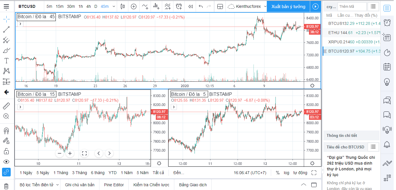 Như bạn thấy đấy, màn hình xuất hiện 3 khung thời gian khác nhau là M5, M15 và M45. Điều này rất tuyệt nếu như bạn muốn bao quát xem xét giá trong cùng 1 khung hình nến, ở các thời điểm khác nhau, để thấy giá chạy như thế nào.