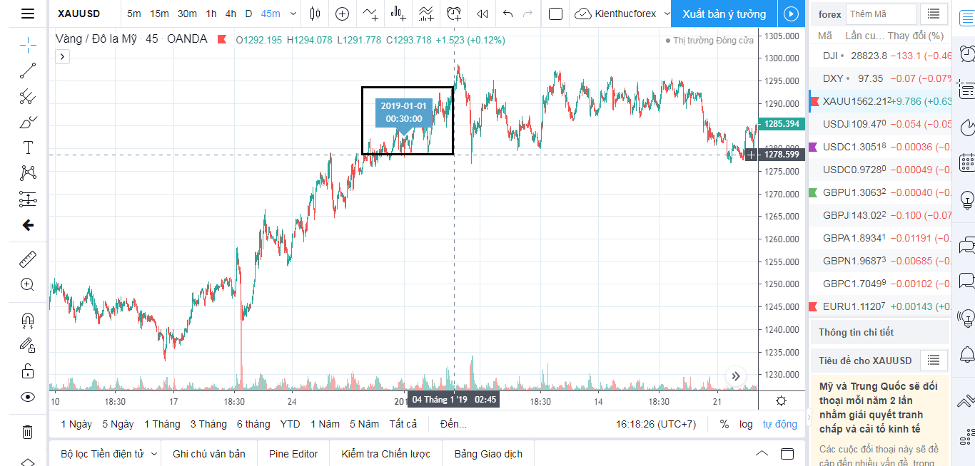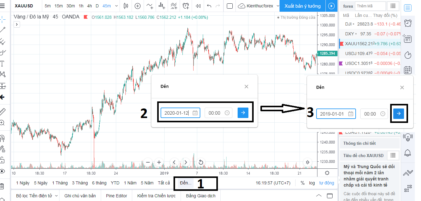 Nếu như bạn xem dữ liệu biểu đồ vàng tại  ngày 1/1/2019 chẳng hạn, mà chỉ dùng tay kéo chart thì sẽ không biết bao giờ mới tới được ngày đó. Nên để tiết kiệm thời gian bạn hãy sử dụng tính năng này như hình bên dưới: