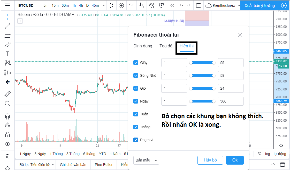 Nếu bạn vẽ ở các khung lớn như khung W chẳng hạn, sau đó bạn kéo xuống xem tại khung M5, bạn sẽ thấy Fibonacci nó choán hết toàn bộ các cây nến, rất khó xem. Vì lẽ đó, nếu chỉ muốn xem ở 1 số khung nhất định thì hãy loại bỏ bớt đi như hình bên dưới: