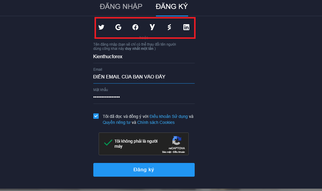 Tại đây, bạn có thể điền toàn bộ thông tin theo hướng thủ công. Hoặc bạn có thể sử dụng 1 trong các mạng xã hội TradingView gợi ý để liên kết tài khoản. Tốt nhất nên điền thông tin theo cách thủ công, rồi nhấn vào đăng ký,bạn nhé.